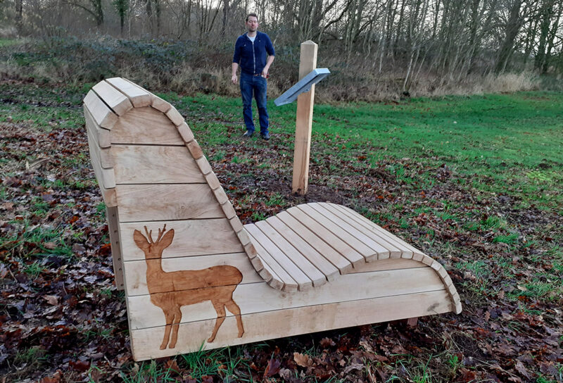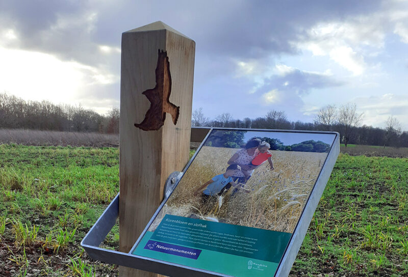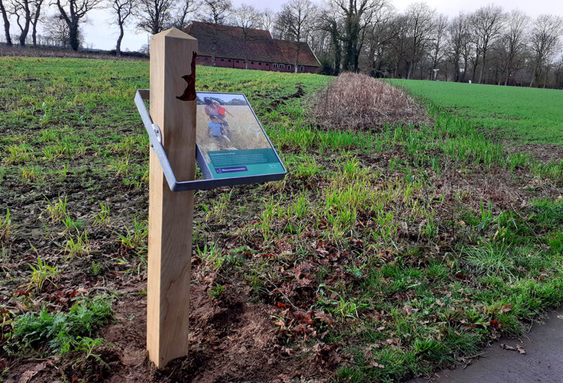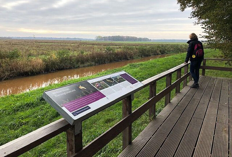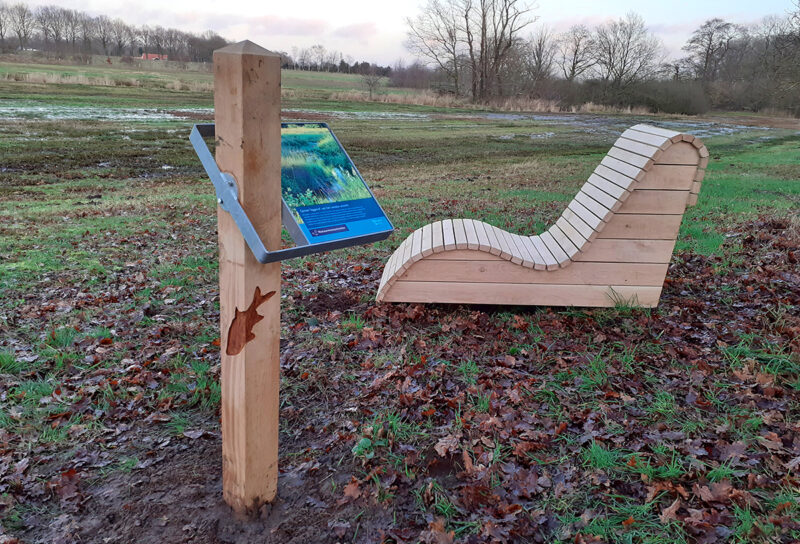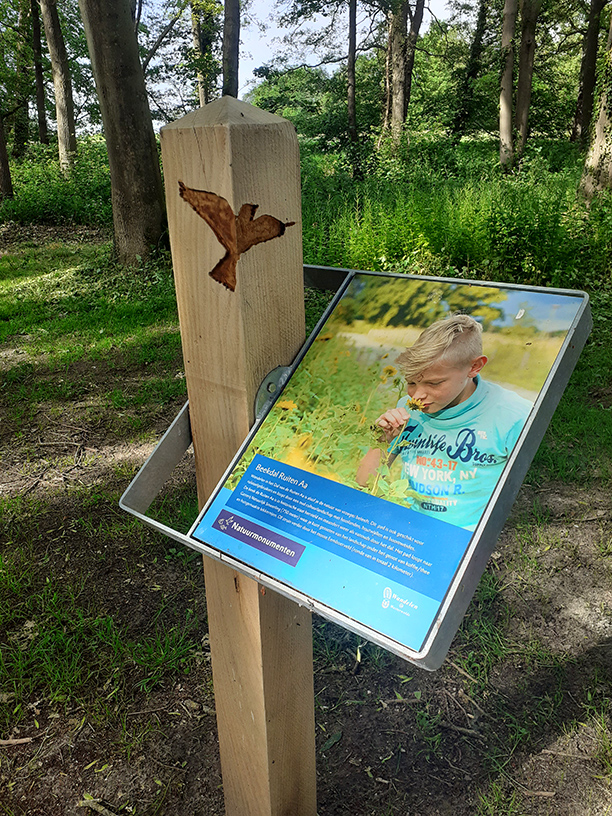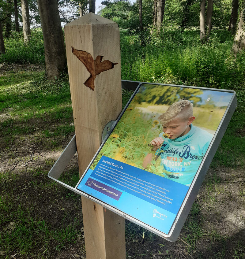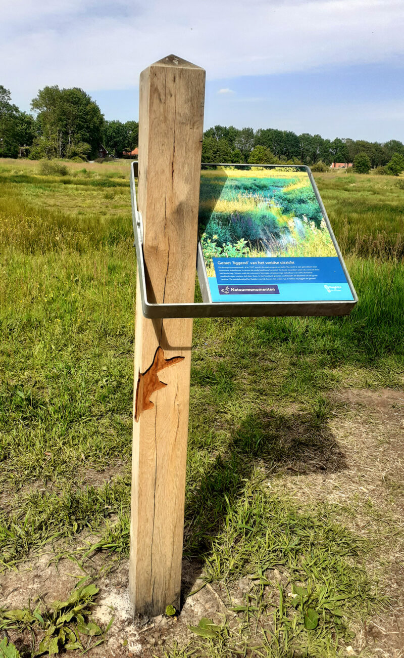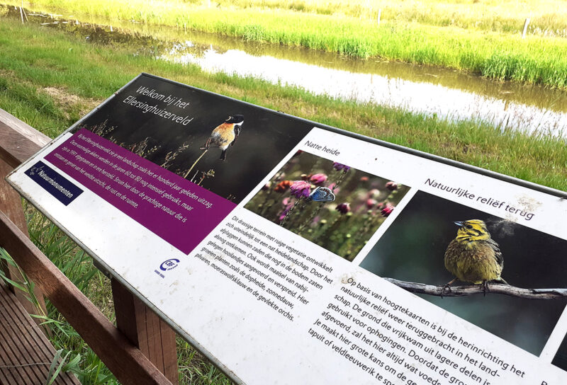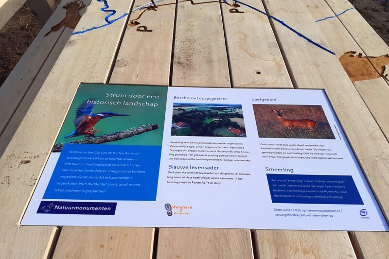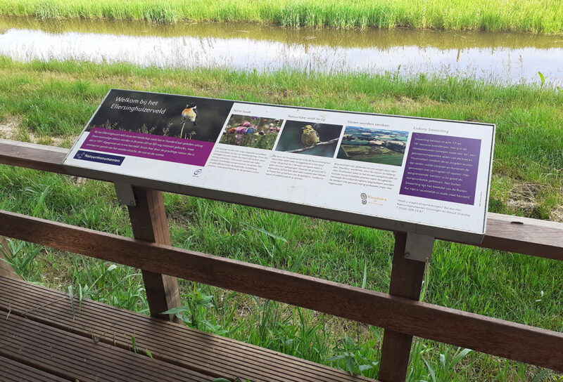 In het eikenhout van de losse infopunten en meubels zijn voor het gebied kenmerkende soorten geaccentueerd door deze uit te fresen, zoals ijsvogel, bever, bermpje, geelgors, das en ree. Bij een uitkijkpunt aan het Ellersinghuizerveld hebben we een thermisch verzinkt frame aangebracht inclusief informatiepaneel. Bij begin- en eindpunt staan inleidende informatiepanelen.