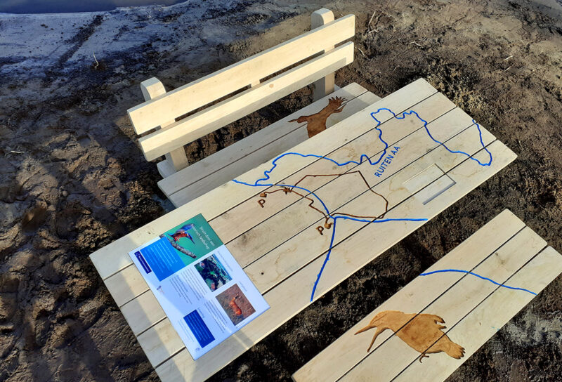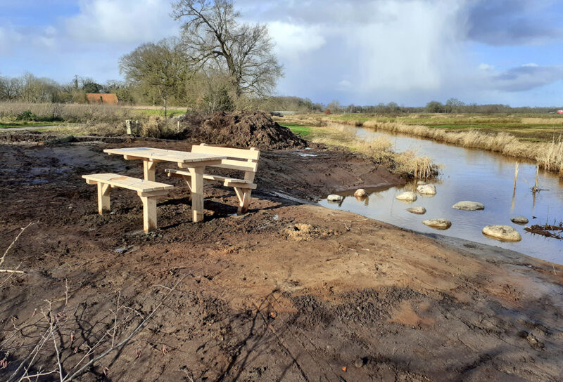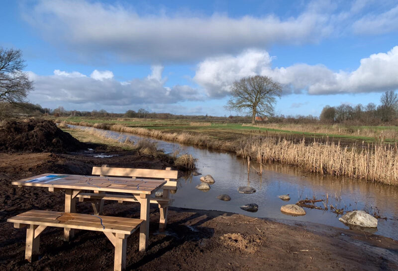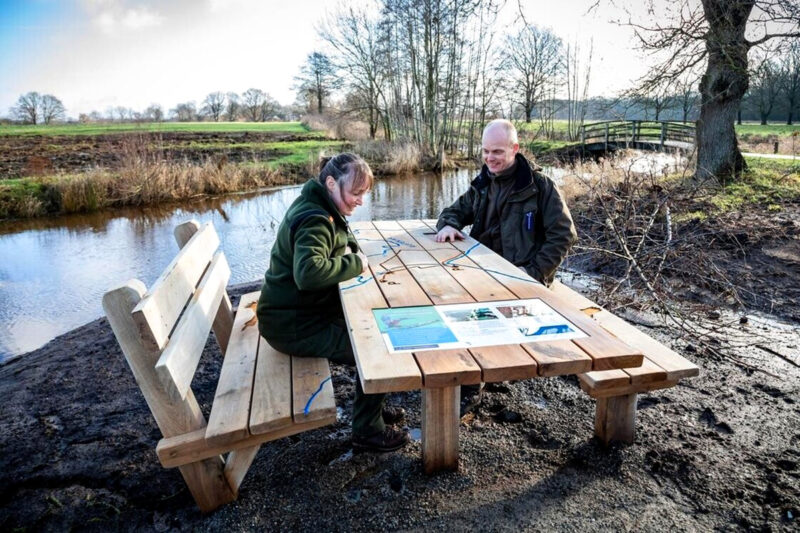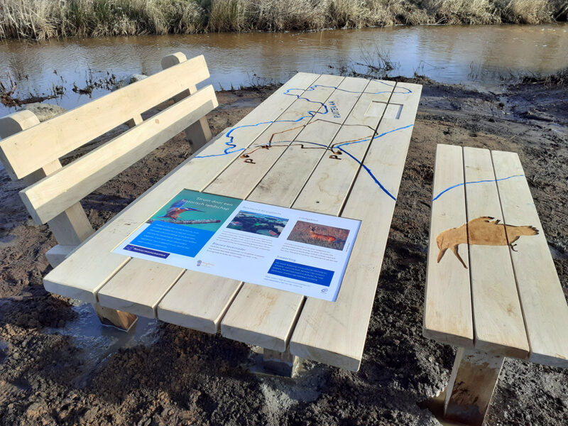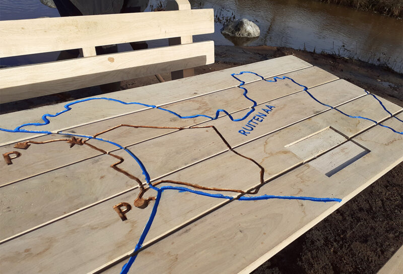 Langs het betonpad zijn verschillende beleefpunten gedefinieerd, zoals een doorwaadbare plaats (voorde), rustpunten en losse infopunten. Bij de voorde realiseerden we een eikenhouten picknicktafel, waarbij de door het landschap meanderende Ruiten Aa en de route uitgefreesd zijn. Het tafelblad is ingelegd met een informatiepaneel en een paneeltje met braille. Het is tevens verlengd en wordt door Natuurmonumenten toegankelijk gemaakt voor mensen met een rolstoel.