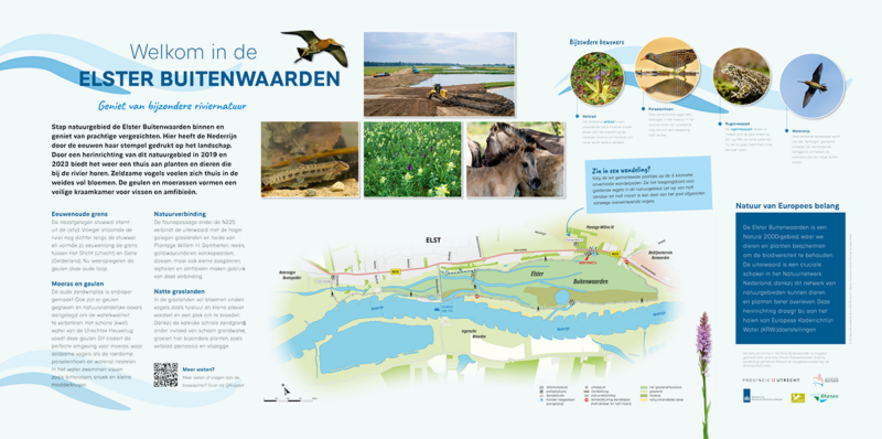 Stap natuurgebied de Elster Buitenwaarden binnen en geniet van prachtige vergezichten. Hier heeft de Nederrijn door de eeuwen haar stempel gedrukt op het landschap. De Elster Buitenwaarden is een Natura 2000-gebied. De uiterwaard is een cruciale schakel in het Natuurnetwerk Nederland; dankzij dit netwerk van natuurgebieden kunnen dieren en planten beter overleven. Door een herinrichting van dit natuurgebied in 2019 en 2023 biedt het weer een thuis aan planten en dieren die bij de rivier horen. Zeldzame vogels voelen zich thuis in de weides vol bloemen. De geulen en moerassen vormen een veilige kraamkamer voor vissen en amfibieën. De herinrichting draagt ook bij aan het halen van Europese Kaderrichtlijn Water (KRW-)doelstellingen.