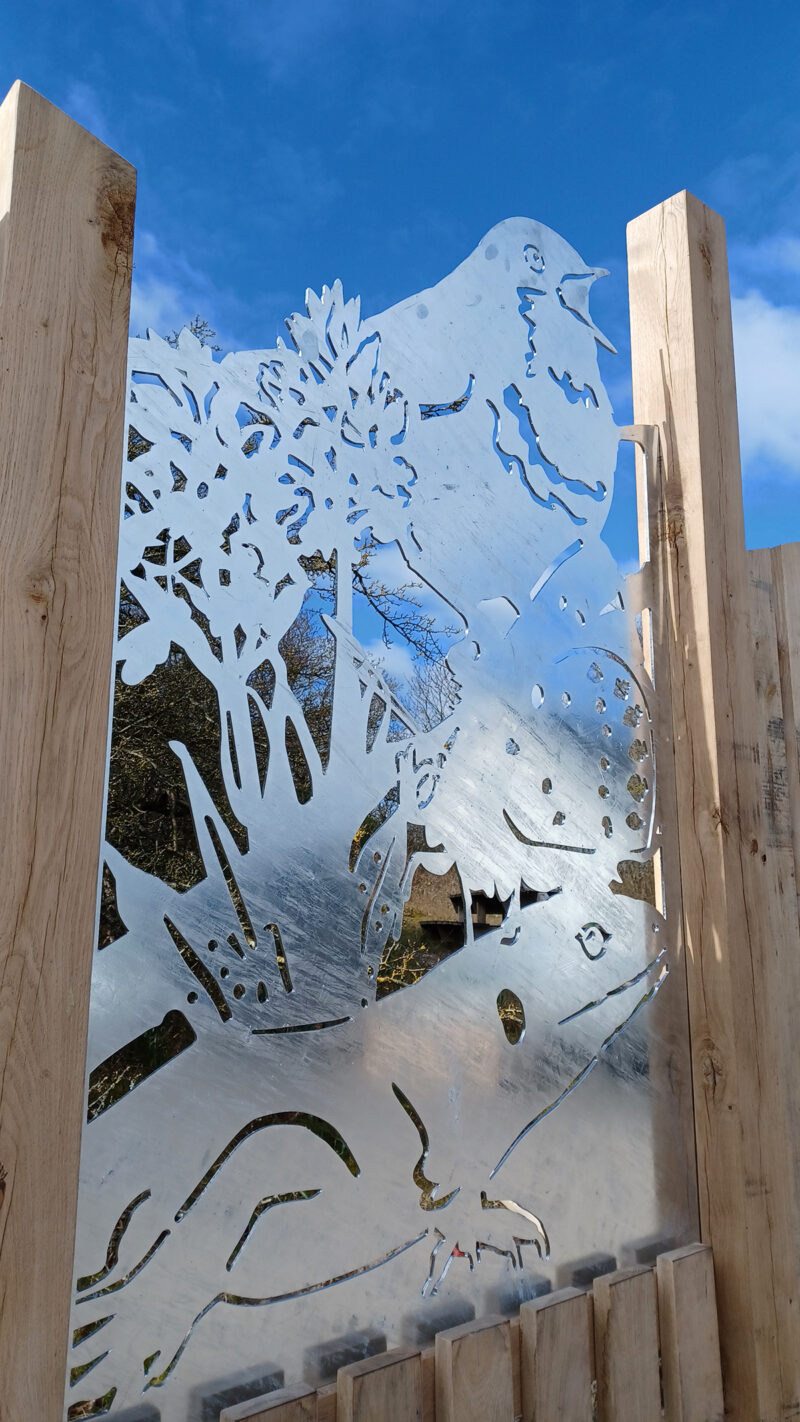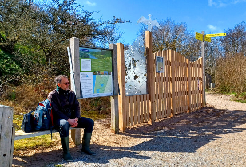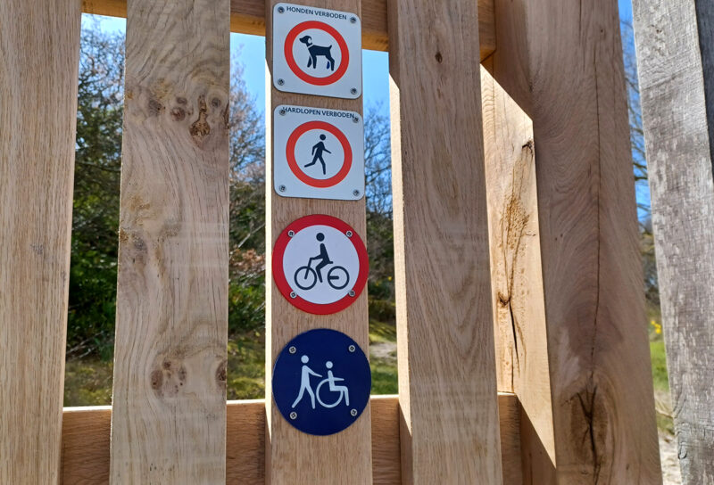 Het ontwerp bestaat uit eikenhouten wanden, opgebouwd uit losse planken, met aan bovenzijde een licht golvende lijn. De entreewand is voorzien van een aantal informatiekastjes, een folderkast en pictogrammen. Een aantal icoonsoorten, zoals de zandhagedis, rietorchis, blauwborst en het icarusblauwtje, sieren de entreewanden. De soorten zijn uitgevoerd in thermisch verzinkt staal.