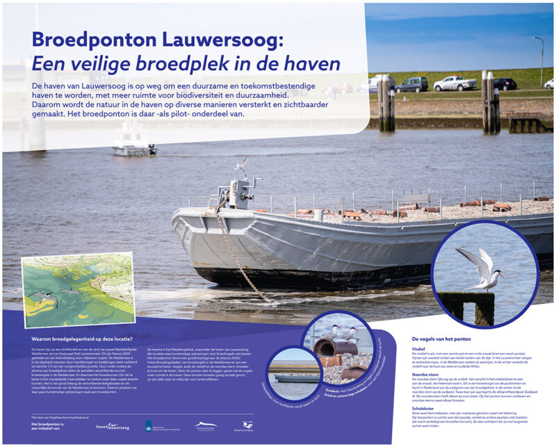De haven van Lauwersoog is op weg om een duurzame en toekomstbestendige haven te worden, met meer ruimte voor biodiversiteit en duurzaamheid. Daarom wordt de natuur in de haven op diverse manieren versterkt en zichtbaarder gemaakt. Het broedponton is daar – als pilot – onderdeel van. Vogels als visdief, noordse stern en scholekster kunnen hier een broedplek vinden.